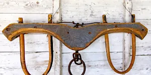 a device for joining together a pair of draft animals, especially oxen, usually consisting of a crosspiece with two bow-shaped pieces, each enclosing the head of an animal; compare harness