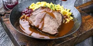 a dish of German origin consisting of beef that is marinated in vinegar with peppercorns, onions, and other seasonings before cooking